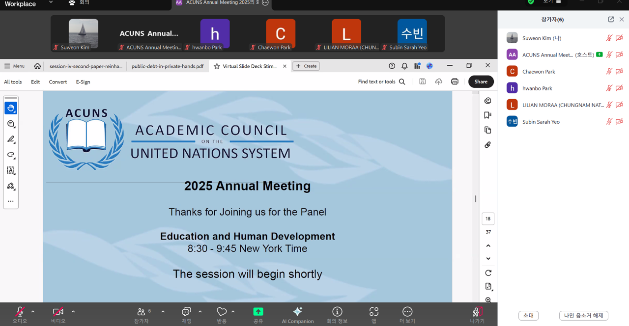 한국유엔체제학회는 지난 2025년 6월 20일부터 22일까지 개최된 ACUNS 연례학술대회에 참여하였습니다. Frank Baumann ACUNS 회장의 주재로 개최된 "Asian perspectives on the Effective Role of the United Nations in the Turbulent Era" 한중일 특별 Roundtable에서는 송영훈 KACUNS 부회장(강원대학교)과 박동준 KACUNS 총무이사(제주평화연구원)가 참석하여 동아시아 국가들이 UN체제에 기여할 수 있는 방안을 모색하였습니다. 아울러, "Education and Human Development"를 주제로 개최된 KACUNS 자체 세션에서는 김수원 KACUNS 연구이사(한국외대)의 사회로 아프리카의 교육발전을 위한 개발 협력, 그리고 듀이(Dewey)의 성장 이론에 기반한 아프리카 개발 협력 등을 논의하였습니다. 참여해주신 모든 분들께 감사의 말씀 드립니다. ![]() ![]() ![]() ![]() ![]() ![]() ![]() ![]() ![]() |
