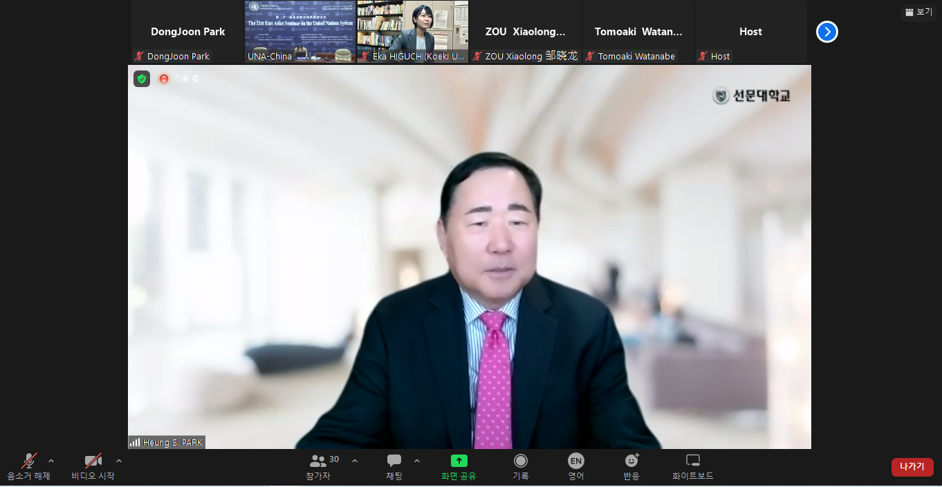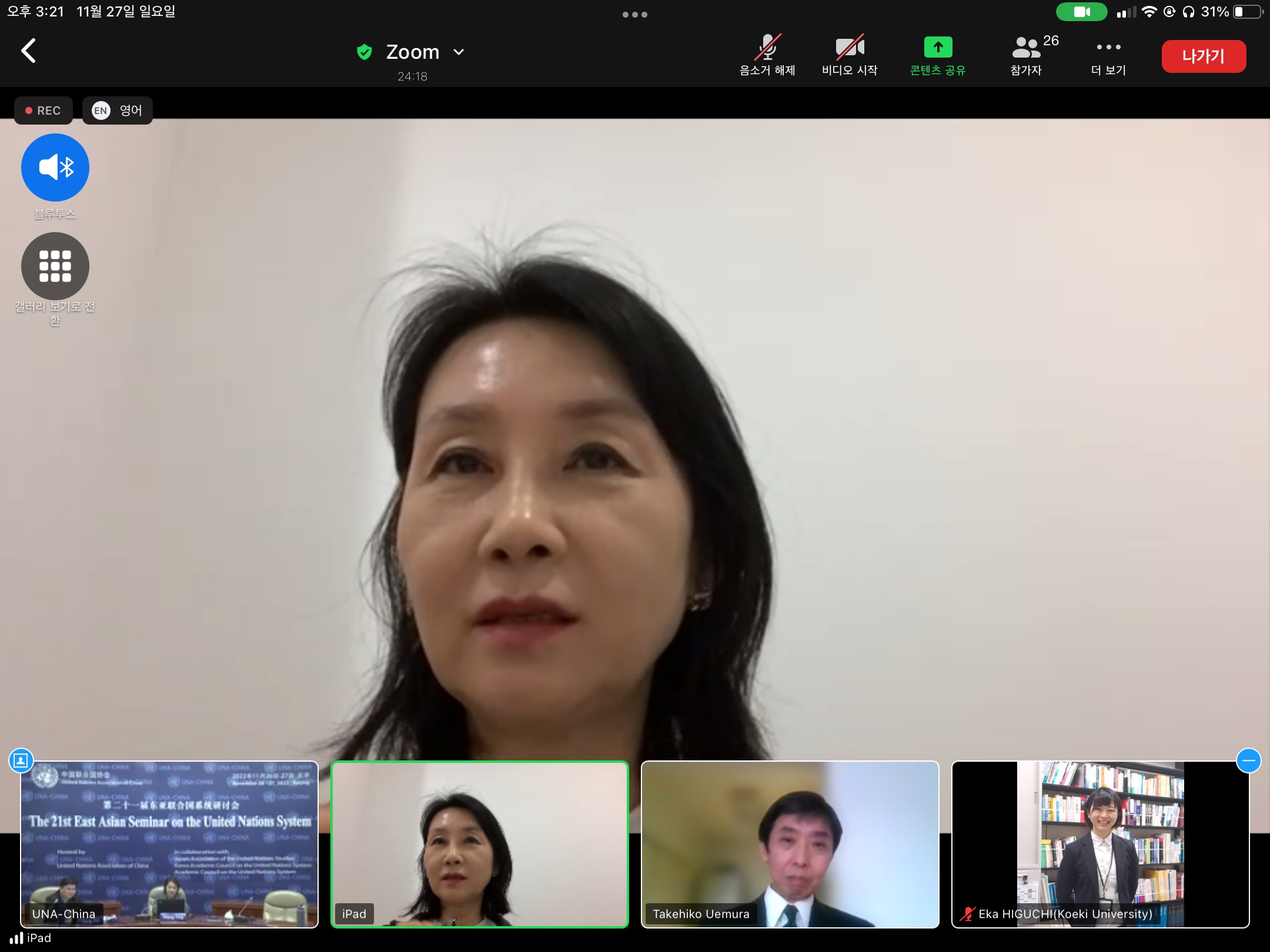 한국유엔체제학회는 2022년 11월 26-27일 중국유엔체제학회가 주관하는 "제21회 동아시아 유엔체제학회 세미나"에 참석하였습니다. 이번 국제 세미나는 중국유엔체제학회가 주관하여 온라인으로 개최되었으며, 한국과 일본 유엔체제학회가 함께 참여하였습니다. 이번 세미나에서는 한중일 3국의 유엔체제 전문가들이 모여 다양한 분야에서 3개국 간 협력 방안 및 유엔의 향후 역할에 대하여 논의하였습니다. ![]() ![]() ![]() ![]() ![]() ![]() ![]() ![]() ![]() ![]() |