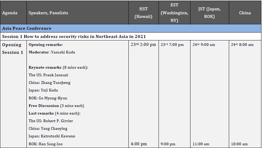 한국유엔체제학회 한승주 이사장과 이신화 회장은 2월 24일 Genron NPO가 주최하고 아산정책연구원, 중국국제전략연구기금회, Pacific Forum 및 카네기국제평화재단이 참여하는 “Asia Peace Conference 2021″의 패널로 참석합니다. 자세한 내용은 아래와 같습니다. Panelists: United States Robert P. Girrier, President, Pacific Forum Douglas Paal, Nonresident Scholar, Asia Program, Carnegie Endowment for International Peace Daniel Russel, Former Assistant Secretary of State for East Asian and Pacific Affairs Frank Jannuzi, President and CEO, The Maureen and Mike Mansfield Foundation China Jia Qingguo, Former Dean, the School of International Studies, Peking University, and a Member of the Chinese People’s Political Consultative Conference Zhang Tuosheng, Principal Researcher, Chairman of Academic Committee, Grandview Institution Yang Chaoying, Vice Chairman, the China Foundation for International and Strategic Studies Republic of Korea Han Sung-Joo, Former Minister of Foreign Affairs of South Korea and Chairman, The Asan Institute for Policy Studies Go Myong-Hyun, Senior Fellow, Center for North Korean Research, The Asan Institute for Policy Studies Lee Shin-wha, Professor, Department of Political Science and International Relations, Korea University Japan Yasushi Kudo, President, the Genron NPO Yoji Koda, Former Commander-in-Chief of Japan’s Self-Defense Fleet Yuji Miyamoto, Former Ambassador to China Yoshihide Soeya, Professor Emeritus, Faculty of Law, Keio University Ken Jimbo, Professor, Faculty of Policy Management, Keio University Masayuki Masuda, Senior Fellow, China Division, National Institute for Defense Studies Masanori Nishi, Former Administrative Vice-Minister of Defense Osamu Onoda, Former Commanding Officer of the Japan Air Self-Defense Force Air Training Command Katsutoshi Kawano, Former Chief of Staff, the Japan Self-Defense Forces Topics: Session 1 How to address security risks in Northeast Asia in 2021 What security risks are we facing in Northeast Asia and beyond the region? What is the cause of the tension? Are the risks preventable, and what efforts are required for that? Session 2 Is the order of peace based on rules and principles achievable in Northeast Asia? Which issues should we address now to avoid accidents and military conflict in Northeast Asia? Is it possible to establish the peaceful order based on rules and principles? What is the ideal order for peace in the region in the long-term views? ![]() ![]() |