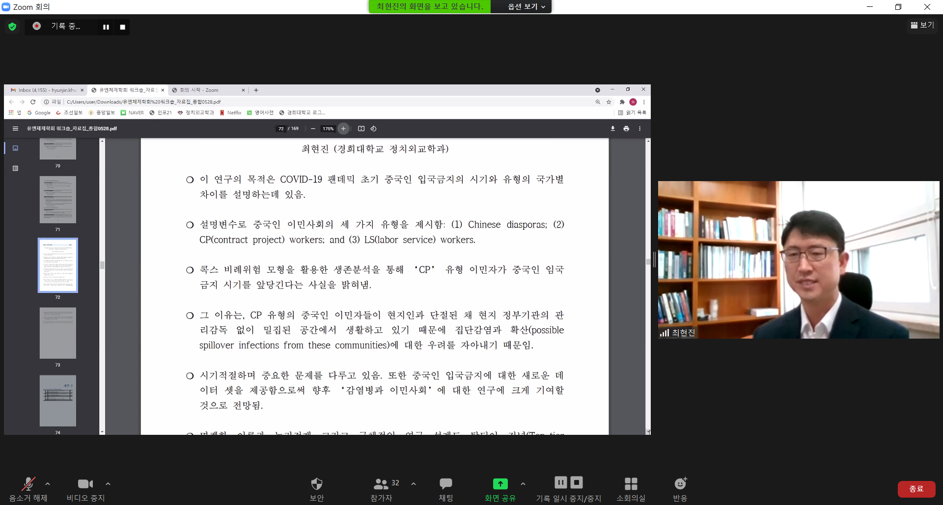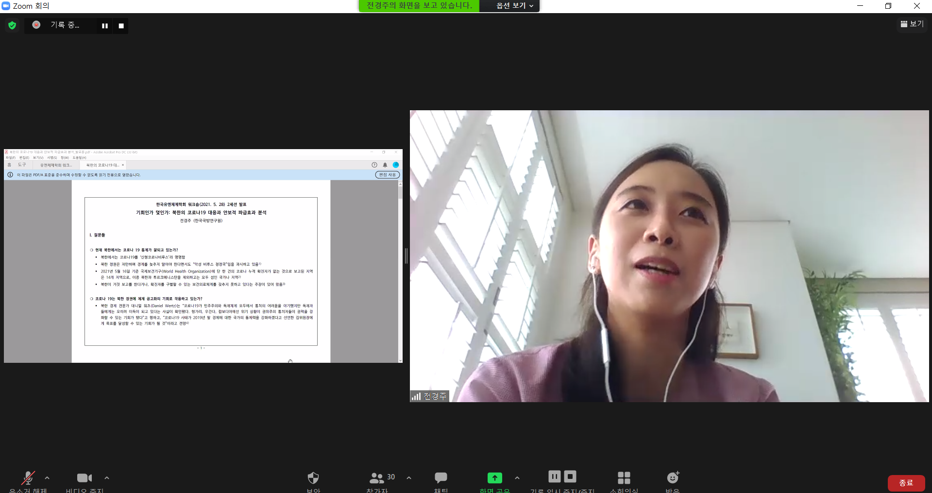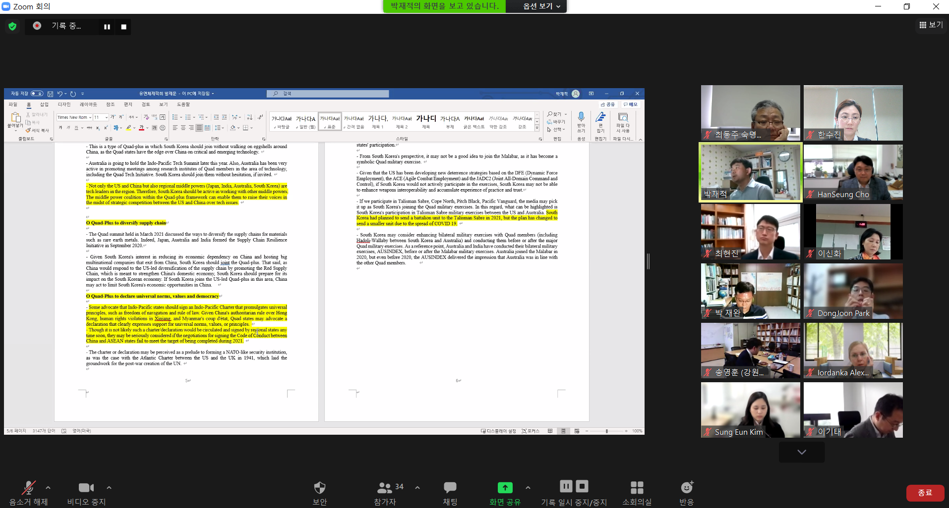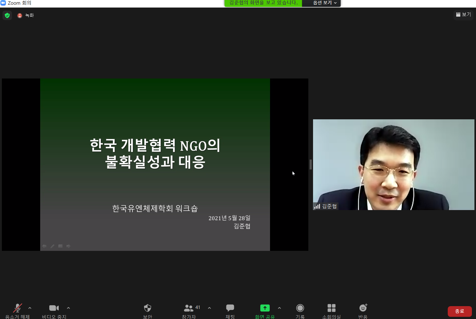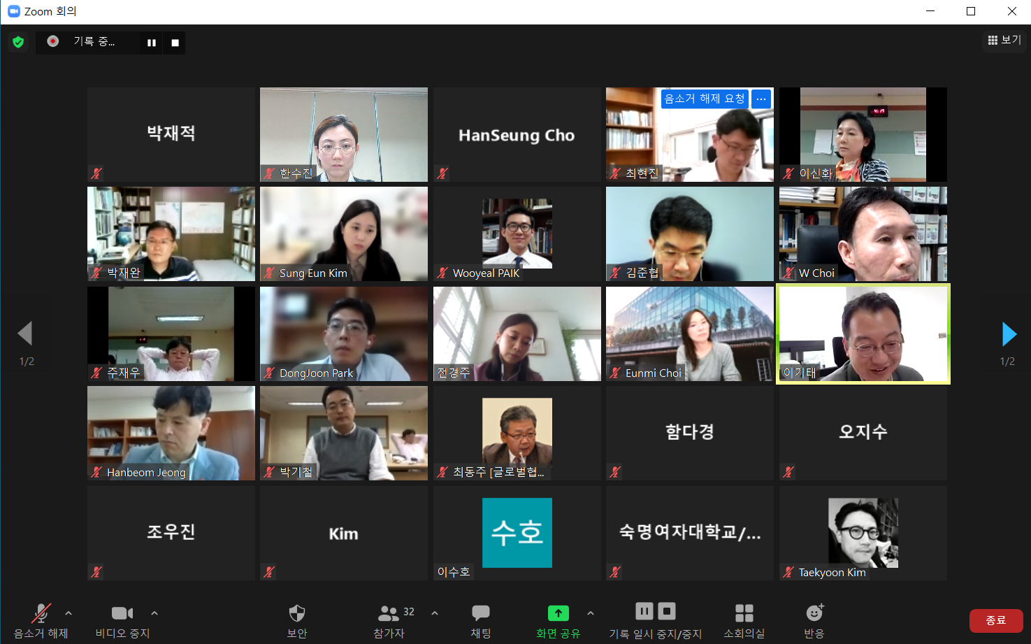 한국유엔체제학회는 5월 28일(금, 13:00-18:20) <코로나19 시대 국제사회의 불확실성과 불평등>을 주제로 온라인 학술회의를 개최하였습니다. 이신화 회장의 개회사와 한경구 고문(유네스코한국위원회 사무총장)의 축사를 시작으로 총 3개의 세션을 진행하였으며, 첫 번째 세션에서는 “코로나19 시대 미중전략 경쟁과 중견국 외교”, 두 번째 세션은 “코로나19 시대 동아시아 안보의 불확실성과 불평등”, 세 번째 세션은 “코로나19 시대 개발협력과 불평등”을 주제로 논의하였습니다. <세션1> 코로나19 시대 미중전략 경쟁과 중견국 외교: https://youtu.be/K8sJIAW19TQ <세션2> 코로나19 시대 동아시아 안보의 불확실성과 불평등: https://youtu.be/Mfgiw_bBMQw |