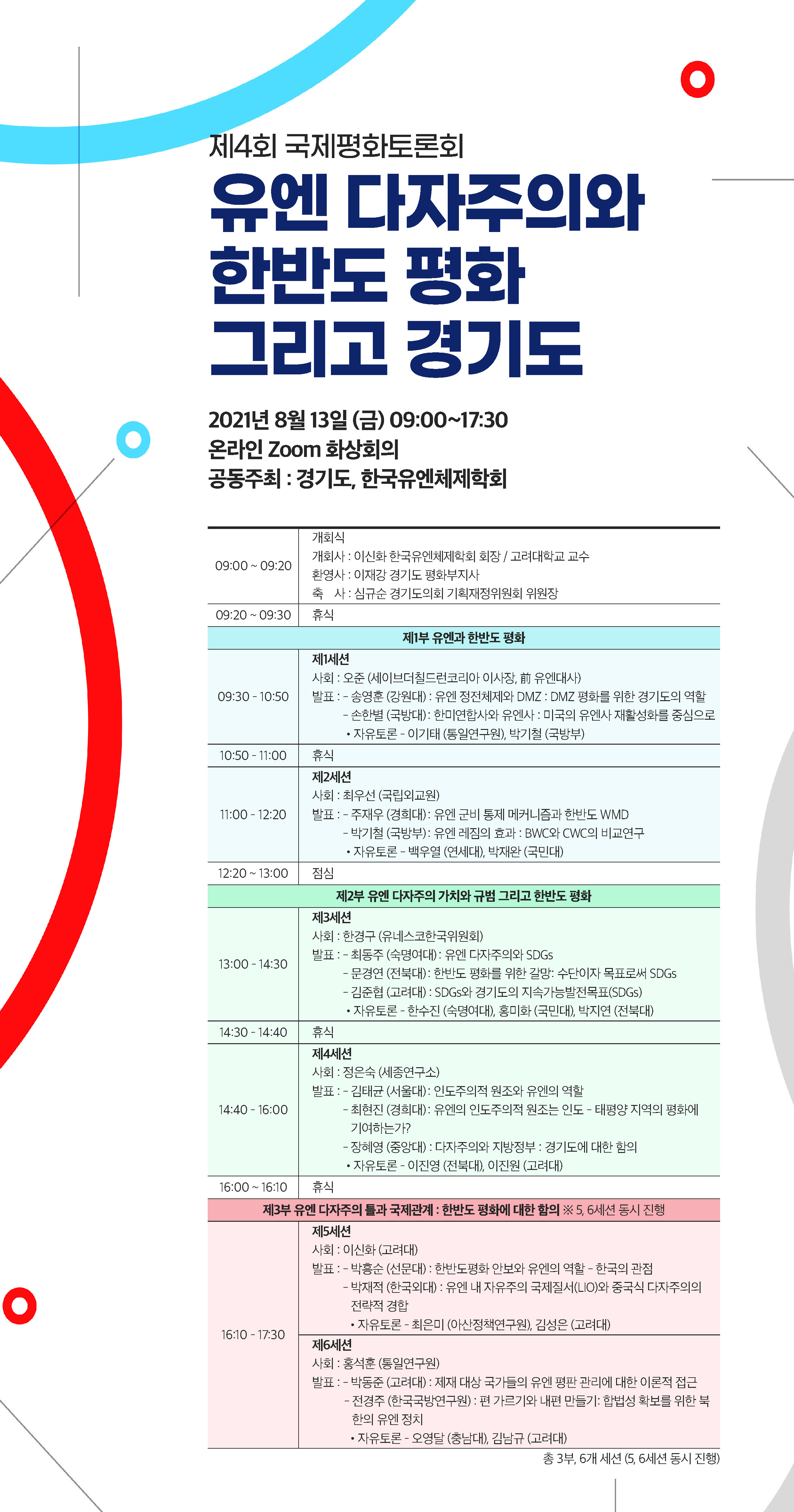 여러분들의 많은 참여와 관심 바랍니다. <유엔 다자주의와 한반도 평화 그리고 경기도> ∙ 8월 13일, 09:00~17:30, 총 3부, 6개 세션(5, 6 세션 동시 진행) ∙ 경기도, 한국유엔체제학회 공동주최