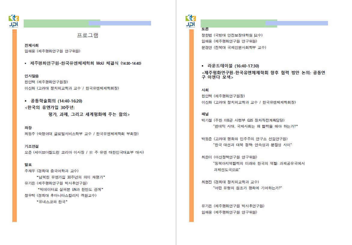 한국유엔체제학회는 제주평화연구원과 공동으로 "한국의 유엔가입 30주년: 평가, 과제 그리고 세계평화에 주는 함의" 를 주제로 공동학술회의를 개최합니다. - 일시: 2021.10.22. (금) 14:30-17:30 - 장소: 제주평화연구원 대회의실 - 주최: 한국유엔체제학회, 제주평화연구원 |