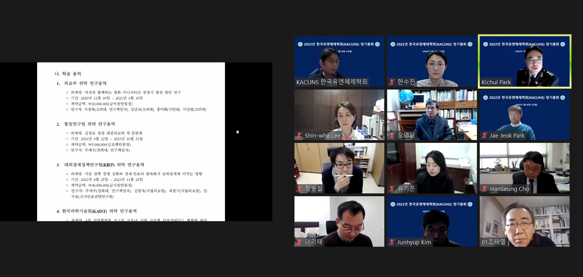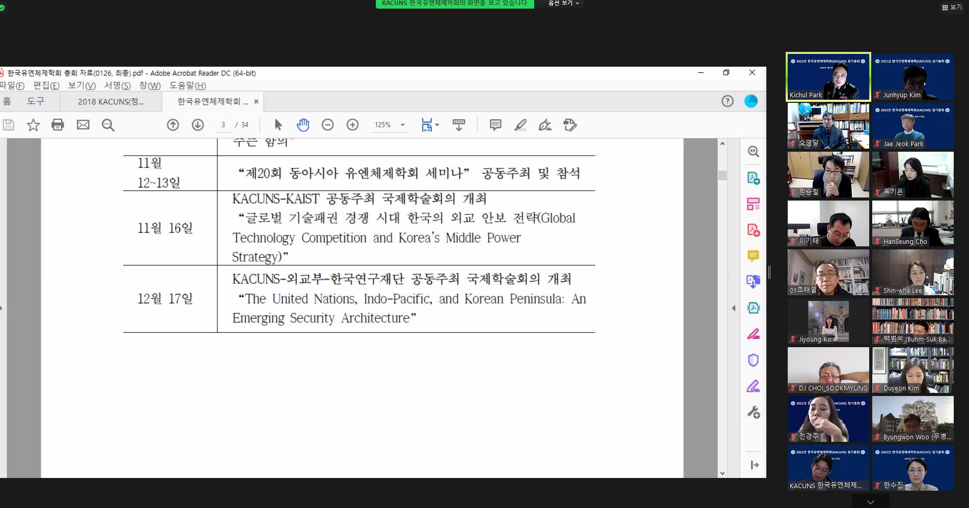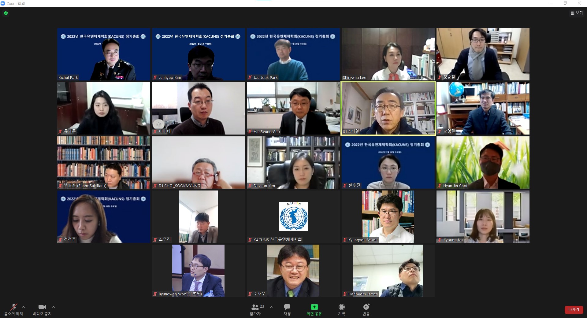 한국유엔체제학회는 2022년 1월 26일(수) 16시에 정기총회를 개최하였습니다. 이번 정기총회에서는 2021년 국내 및 국제 학술회의, 학술용역 활동, 감사보고, 학회 회원 명단 및 회비 납부 현황 및 2022년 활동 계획을 보고하였습니다. 앞으로도 한국유엔체제학회의 활동에 많은 관심과 성원 바랍니다. ![]() ![]() ![]() |
