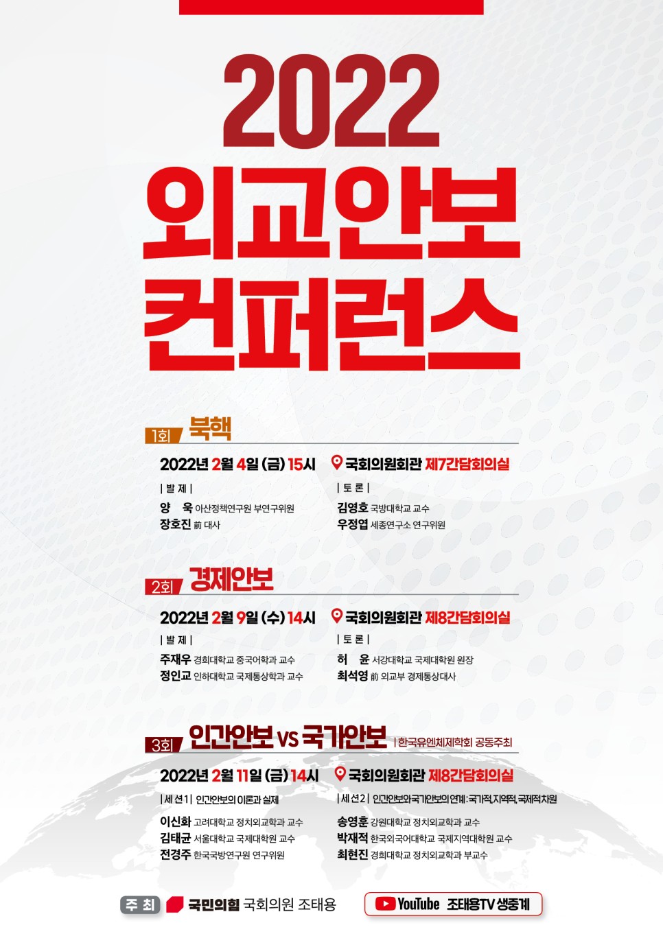 한국유엔체제학회와 조태용 국회의원이 공동으로 "2022 외교안보 컨퍼런스"를 주최합니다. 여러분의 많은 관심과 참여 바랍니다.